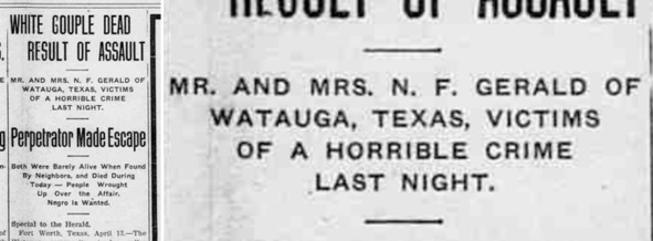 Красноречивый образчик журналистской работы 1908 г.: в статье, посвященной убийству в Уотоге, неправильно указаны имя и фамилия главы семейства (N. F. Gerald вместо M. F. Gerrell). В этой же статье написано о том, что убийцы являлись неграми, хотя в сообщениях других газет сообщалось о мексиканцах.