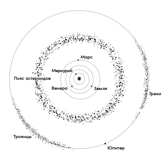 Рис. 2.8. Греки и троянцы по две стороны от Юпитера. Их разделяет расстояние, равное примерно десяти расстояниям от Земли до Солнца. Ближе к Солнцу, внутри орбиты Юпитера находится главный пояс астероидов