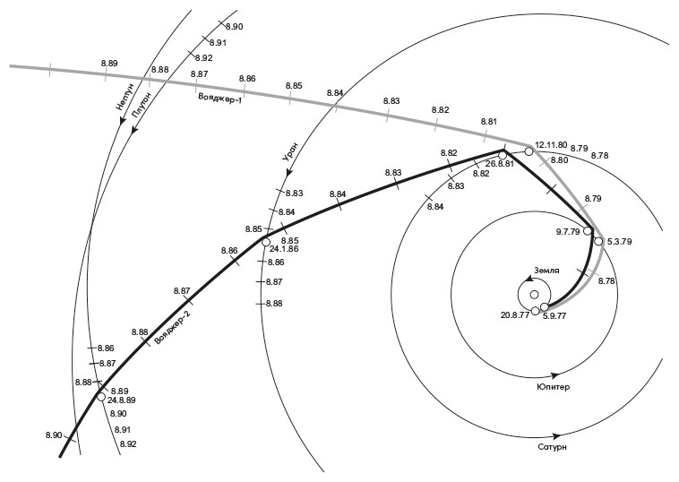Рис. 2.10. Большие планеты изменяют траектории «Вояджеров», ускоряя их при этом. Засечками показаны точки траектории, в которых «Вояджеры» и планеты находились в определенные даты каждый год