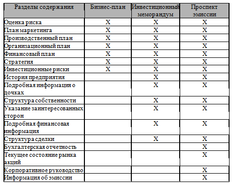 Таблица 1. Сравнение содержания основных инвестиционных документов