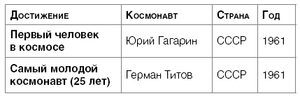Внеземные пионерыТо, что Юрий Гагарин был первым человеком в космосе, сегодня знает любой образованный человек. Однако среди космонавтов было немало и других «пионеров», каждый из которых был первым в своем роде.