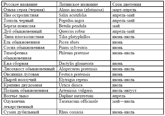 Таблица 1. Средние сроки цветения некоторых аллергенных растений