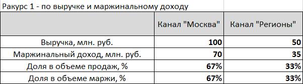 Выручка канала «Москва» – 100 млн руб. в год. Выручка канала «Регионы» – 50 млн руб. в год. Прямые затраты составляют 30% от выручки. Маржинальный доход по прямым затратам – 70% от выручки.