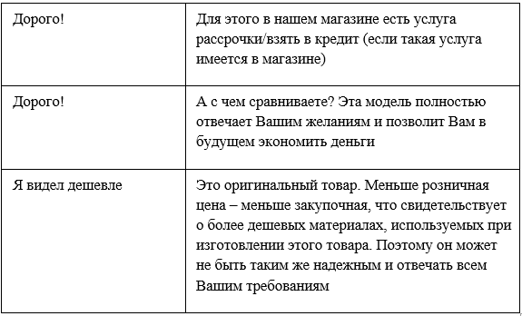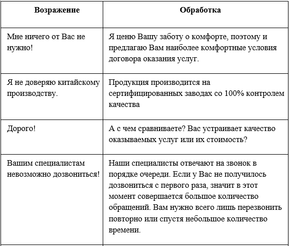 Здесь так же возьмите листок бумаги и запишите слева возражения, имевшие место быть в вашей практике, а справа продумайте и запишите варианты их снятия.