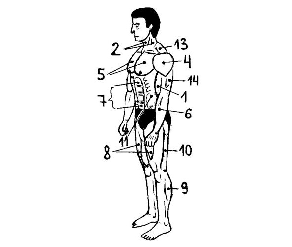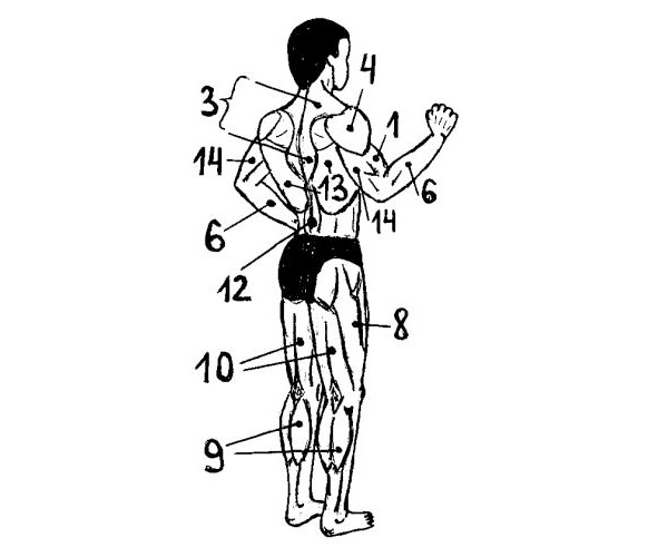 14. Трехглавая мышца плеча (трицепс). Расположена на задней поверхности плеча. Эта мышца разгибает руку в локтевом суставе.