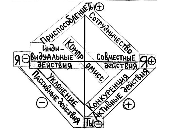 В любом конфликте каждый из его участников оценивает и соотносит свои интересы и интересы соперника, задавая себе вопросы: «Что Я выиграю?», «Что Я проиграю?», «Какое значение имеет предмет спора для моего соперника?» и так далее. На основе этого он сознательно выбирает ту или иную стратегию поведения (уход, принуждение, компромисс, уступка или сотрудничество). Часто бывает так, что отражение этих интересов происходит неосознанно, и тогда поведение в конфликтном взаимодействии насыщено мощным эмоциональным напряжением и носит спонтанный характер. Для эффективного решения проблемы нужно выбрать определенный стиль поведения, учитывая при этом свой собственный стиль, и стиль других вовлеченных в конфликт людей, а также природу самого конфликта. Можно выделить пять таких основных стилей. Они связаны с общим источником любого конфликта – несовпадением интересов двух и более сторон. Стиль поведения человека в конкретном конфликте определяется той мерой, в которой он хочет удовлетворить собственные интересы (действуя пассивно или активно и интересы другой стороны (действуя совместно или индивидуально). Если реакция человека пассивна, то он будет стараться выйти из конфликта, если она активна, то он примет попытки разрешить его. Такие оценки можно сделать для всех сторон, участвующих в конфликте. Правый сектор «психологического креста» на рисунке 2 относится к совместным действиям. Если человек предпочитает совместные действия, то он будет пытаться разрешить конфликт вместе с другим человеком, или участвующими в нем людьми. Если же человек предпочитает действовать индивидуально, то он будет искать свой путь решения проблемы или уклонения от ее решения (левый нижний сектор «психологического креста»). В центре находится стиль компромисса, который в равной мере включает в себя кооперативное и индивидуальное, а также пассивное и активное поведение. Каждый человек обычно пользуется одним из этих пяти стилей, хотя в определенных условиях может отдать предпочтение другому стилю. Некоторые стили наиболее эффективны при разрешении конфликтов определенного типа.