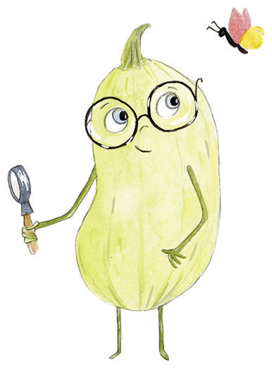 Теперь разрешите представить весёлого и наблюдательного Кабачка. Он обожает смотреть по сторонам, задавать вопросы и искать ответы. Ничему и никому не веря на слово, он предпочитает проверять факты самостоятельно. Когда вы встретитесь на страницах книги, он обязательно предложит тебе поиграть в «Кабачковую игру». Не отказывайся: играя, ты увидишь, как тайная жизнь овощей проявляется в нашем мире – нужно только уметь её разглядеть.