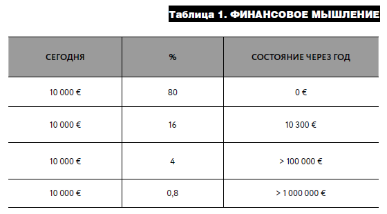 Что такое финансовое мышление?Один экономист XIX века сказал: «Давайте разделим богатство поровну и распределим его между всеми гражданами, и вы увидите, что вскоре оно снова окажется в тех же руках, что и сейчас». Быть богатым – это привычка, образ жизни. К сожалению, быть бедным – тоже привычка. Используя закон Парето о богатстве населения в качестве отправной точки, мы можем приблизительно вывести, сколько людей из 1000 будут богатыми. Лично я после многих лет обучения полностью согласен с этими цифрами. Если я дам 10 000 евро 1000 человек, то через год у 80 % из них будет ноль денег или в любом случае меньше, чем было изначально, 16 % покроют инфляцию, поэтому они смогут вернуть мне около 10 300 евро, а 4 % будут иметь более 100 000 евро. 20 % из этих 4 % (0,8 %) будут иметь более 1 миллиона евро.