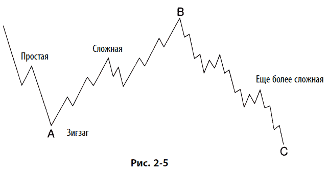Довольно часто, когда большая коррекция начинается с простого зигзага a – b–с в волне А, волна В вытягивается в более сложно подразделяемый зигзаг a – b–с, чем и достигается вид чередования, изображенный на рис. 2–4. Обратный порядок сложности встречается реже. Пример возникновения такого порядка может быть найден в волне 4 на рис. 2-16.