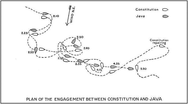 Upon seeing the "Constitution" in the south-southwest, the British captain shaped his course for her, directing the prize to enter the harbor. Bainbridge, watching these movements, now tacked his ship, and at 11.30 A.M. steered away southeast under all plain sail, to draw the enemy well away from neutral waters; the Portuguese authorities having shown some sensitiveness on that score. The "Java" followed, running full ten miles an hour, a great speed in those days, and gaining rapidly. At 1.30, being now as far off shore as desired, Bainbridge went about and stood toward the enemy, who kept away with a view to rake, which the "Constitution" avoided by the usual means of wearing, resuming her course southeast, but under canvas much reduced. At 2.10 the "Java," having closed to a half mile, the "Constitution" fired one gun ahead of her; whereupon the British ship hoisted her colors, and the American then fired two broadsides. The "Java" now took up a position to windward of the "Constitution," on her port side, a little forward (2.10); "within pistol-shot," according to the minutes submitted by the officer who succeeded to the command; "much further than I wished," by Bainbridge's journal. It is not possible entirely to reconcile the pretty full details of further movements given by each;4 but it may be said, generally, that this battle was not mainly an artillery duel, like those of the "Constitution" and "Guerrière," the "Wasp" and "Frolic," nor yet one in which a principal manœuvre, by its decisive effect upon the use of artillery, played the determining part, as was the case with the "United States" and "Macedonian." Here it was a combination of the two factors, a succession of evolutions resembling the changes of position, the retreats and advances, of a fencing or boxing match, in which the opponents work round the ring; accompanied by a continual play of the guns, answering to the thrusts and blows of individual encounter. In this game of manœuvres the "Constitution" was somewhat handicapped by her wheel being shot away at 2.30. The rudder remained unharmed; but working a ship by relieving tackles, the substitute for the wheel, is for several reasons neither as quick nor as accurate.