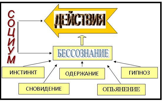 В таких состояниях психики человек не отдаёт отчёт о совершаемых им поступках. Природная и культурная среда обитания индивида формирует его бессознательное функционирование. Социум своим огромным коллективным сознанием влияет на внутренний мир человека, задаёт ему программу действий, которые личность совершает вне своей воли (подробности рассмотрим ниже).