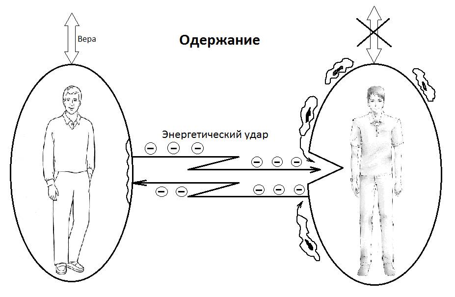 После смерти физического тела, сознание личности продолжает существовать в тонкоматериальном теле (что и называют в народе душой), но, не имея устремлённости вверх к своему Духовному Началу, застревает в низших мирах астрального мира (Кама Локе). То, к чему стремилась личность, ещё при жизни, и губит её. По закону магнита или взаимного влечения, сознание личности притягивается туда, куда стремилось. Застрявшие, развоплощённые сущности «сгорают от собственных страстей» – это и есть библейский ад, ибо, лишившись физического тела, через которое они могли удовлетворять свои страсти (пить, курить, употреблять наркотики и прочее), они мучаются. В конце концов, их ждёт полное разложение. Но, чтобы выжить в Кама Локе, они питаются разложением других существ и тянутся к тем, кто ведёт подобную им физическую жизнь. Они, не имея физического тела, не могут удовлетворять свои страсти и поэтому тянутся на физический план к людям. Присосавшись к ауре алкоголика или наркомана, они питаются флюидами алкогольных и наркотических веществ, излучаемых человеческим телом. При употреблении горячительных напитков происходит огромный выброс энергии, что и нужно этим сущностям (в народе называют их лярвами). Пока они находятся на внешней стороне ауры, их роль маленькая – «шептать», «подкидывать вредные идеи», подталкивать человека к нужным им поступкам. Но, когда чья-то «огромная стрела» (злой, разрушительной человеческой воли) пронзила ауру человека, и образовался пробой в заградительной сети, а это возможно, если нет подпитки с Высших миров, то эти сущности тонкого мира устремляются вовнутрь и завладевают физическим телом человека, как своим. И таких одержателей может быть множество. При этом сознание или душа человека вытесняется из физического тела, но не полностью, чтобы не убить человека сразу (как грифель в карандаше можно вытолкать другим грифелем наполовину). Завладев физическим телом, они становятся полновластными хозяевами и делают с этим телом всё, что им нужно – это и есть одержание. Для образного представления предлагаю рассмотреть рисунок №6