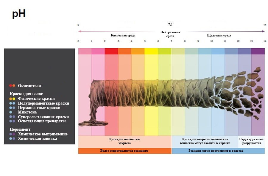 Щелочь при окрашивании забивает чешуйки волоса и раскрывает их. Поэтому обязательное условие после окрашивания – закрыть кутикулу продуктом, имеющим кислым pH.
