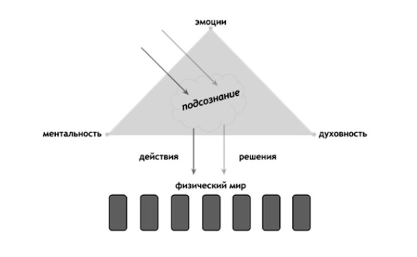 Имеются четыре уровня жизни: физический, эмоциональный, ментальный и духовный, из которых эмоциональный, ментальный и духовный формируют физический уровень. Если вы посмотрите на картинку ниже, то в увидите, что эмоциональный, ментальный и духовный уровни формируют некий треугольник – это и есть ваше подсознание.
