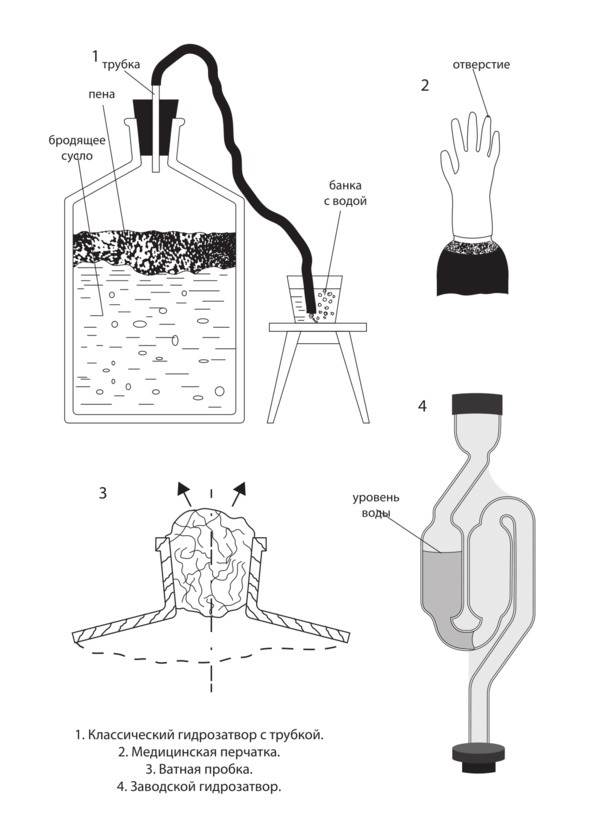 Во время брожения активно выделяется углекислый газ (примерно 4 кубометра на 1 л полученного спирта). Накопление углекислоты чревато высоким давлением в бродильной емкости, что может привести к взрыву. Газ нужно выводить, но делать это так, чтобы в емкость не попал кислород, иначе сусло скиснет. Гидрозатвор для брожения представляет собой клапан, выводящий углекислый газ и одновременно препятствующий попаданию воздуха.