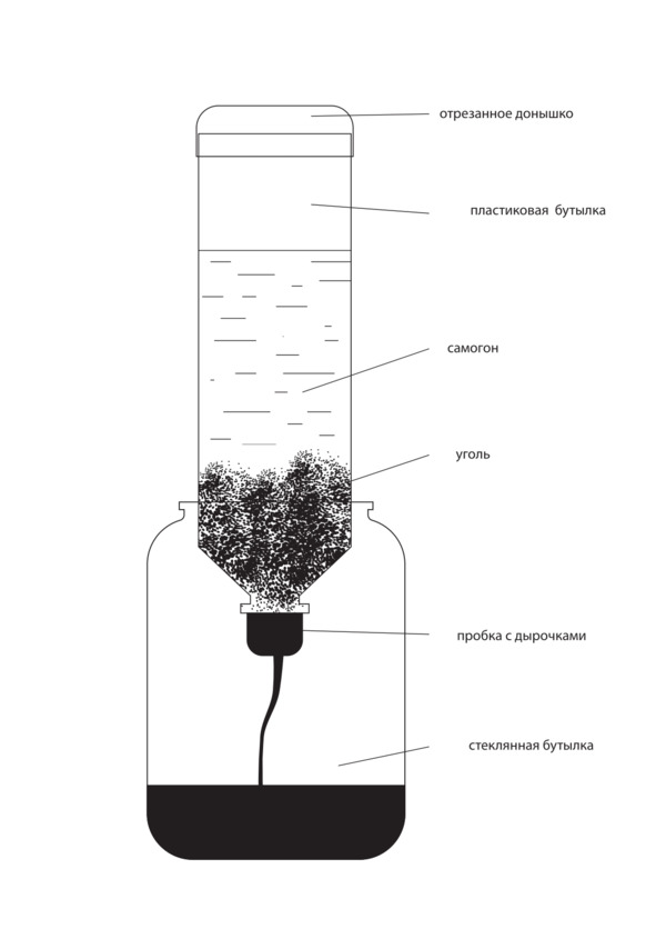 1. Отрезать донышко двух- или трехлитровой бутылки. Просверлить (прожечь) в нем 5—6 дырок на равном расстоянии друг от друга. Донышко с дырками нужно, чтобы прижимать уголь книзу, иначе он будет плавать по всей бутылке. В крышке бутылки просверлить одно отверстие большого диаметра, через которое будет стекать отфильтрованный самогон.