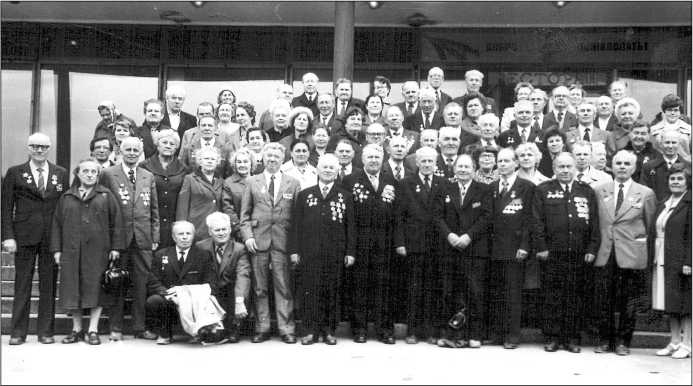 Ветераны Великой Отечественной войны. Защитники и освободители Моонзундских островов на встрече в Лениграде 14.09.1985 г. Я. М. Вьюгин в первом ряду 7-й справа.