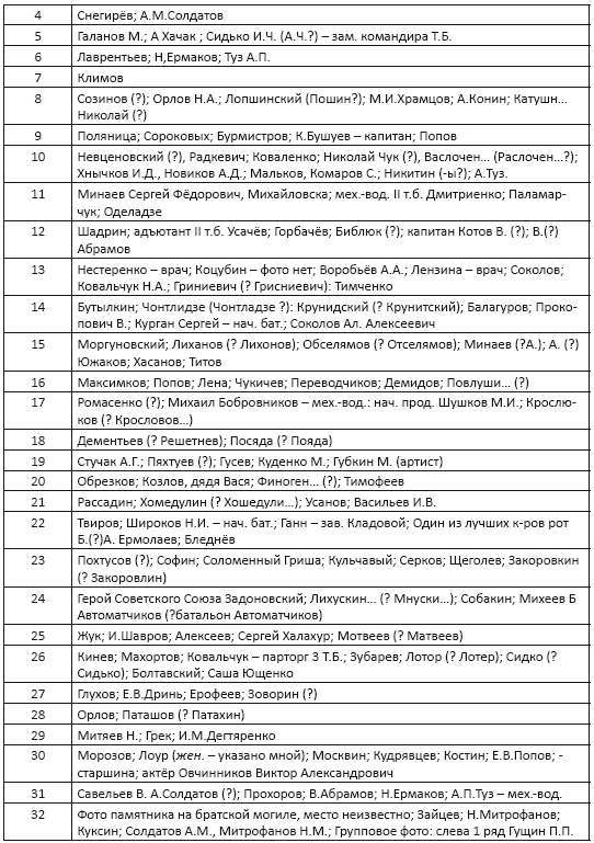 Возможно, кто-то из родных узнает на любительских снимках своих родных. Большая просьба ко всем, кто восстановит фамилии и имена солдат на снимках 1941–1945 годов, сообщить по адресу paraartiada@yandex.ru. Хорошо бы узнать и назвать всех солдат поимённо. Спешите: время беспощадно-стремительно несётся в безграничность! Ведь солдаты, освободившие мир от коричневой чумы, не были безымянными. Они кровью своей вписали страницы истории Родины в общую историю мира и подписали их! Вернём их имена!