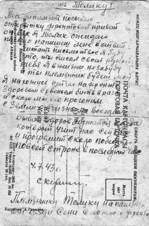 P.S. Хотелось, чтобы ксерокопия открытки с фронта Великой Отечественной войны, была опубликована. Пусть она напоминает нам о тех, кто отдал свою жизнь, чтобы мы мирно жили и растили своих детей.