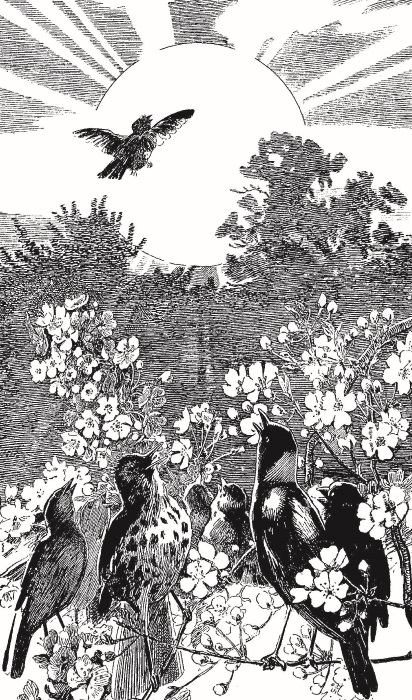Тепло было на солнышке… Небо было ясное, голубое. На берёзах, на плетне, по крышам громко чирикали воробьи – и им тоже любо было погреться на солнце после долгой, суровой зимы.