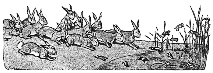 Понеслись зайцы во всю прыть к реке. А лягушки, как увидели их, и давай со страху в реку прыгать – «шлёп-шлёп»…
