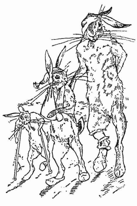 – Что же, деточки, всё по-хорошему и выйдет. И точно, он вас уму-разуму научил. Без него жили вы, как всем зайцам жить полагается. А вам и это в тяготу показалось. А вот, как теперь он на вас уж действительно тяготу наложил, так вам прежняя-то жизнь за счастье кажется… Вот он как просветил-то вас.