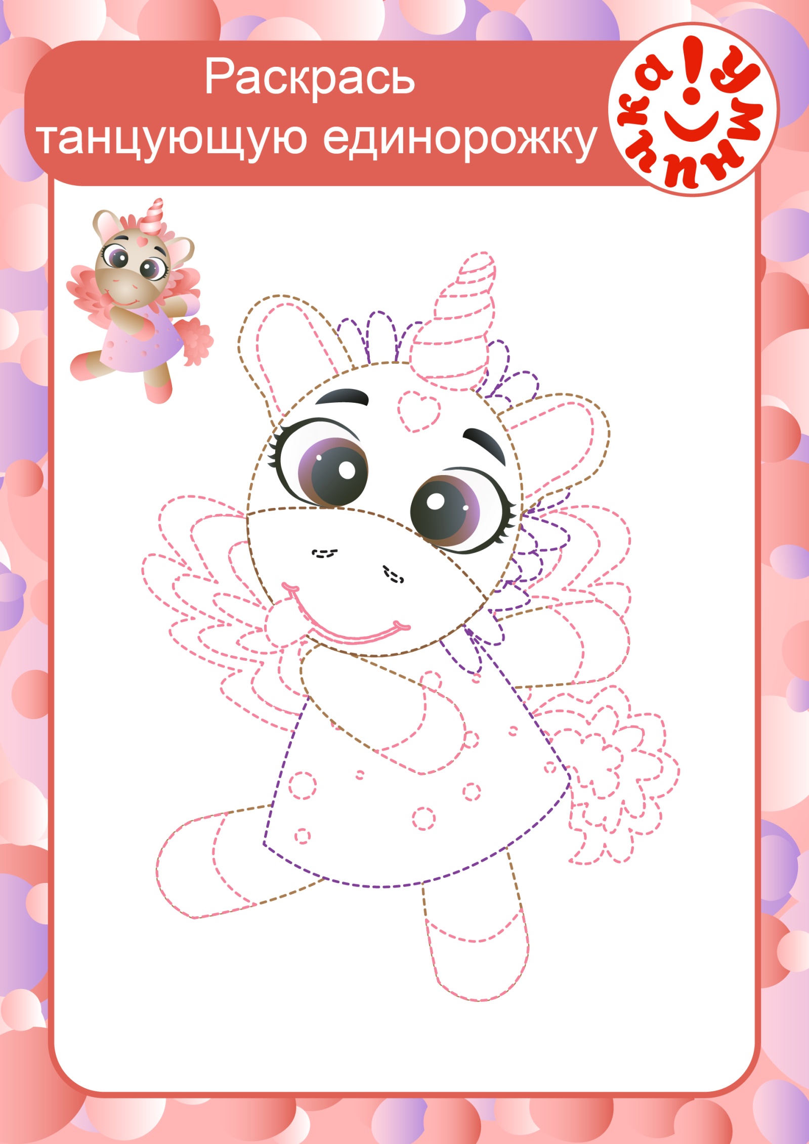 Раскрась единорожку. Сначала аккуратно проведи цветными карандашами по пунктирным линиям, а затем раскрась полностью все белые части. Если не торопиться, получится очень красиво!