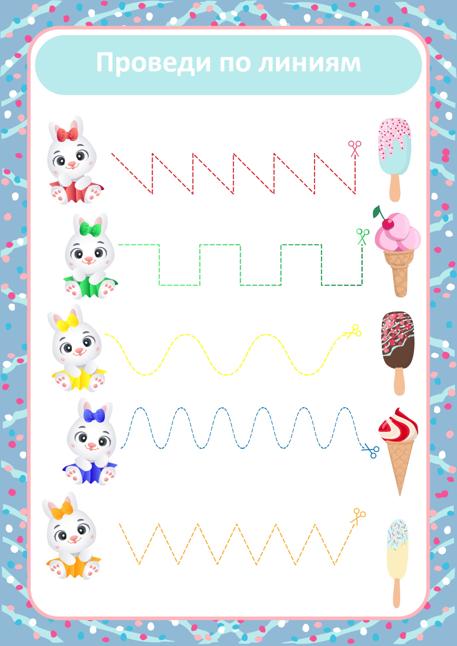 Дай каждому милому зайчику по мороженому. Для этого проведи по линии цветными карандашами, а затем ножницами вырежи по этим линиям.