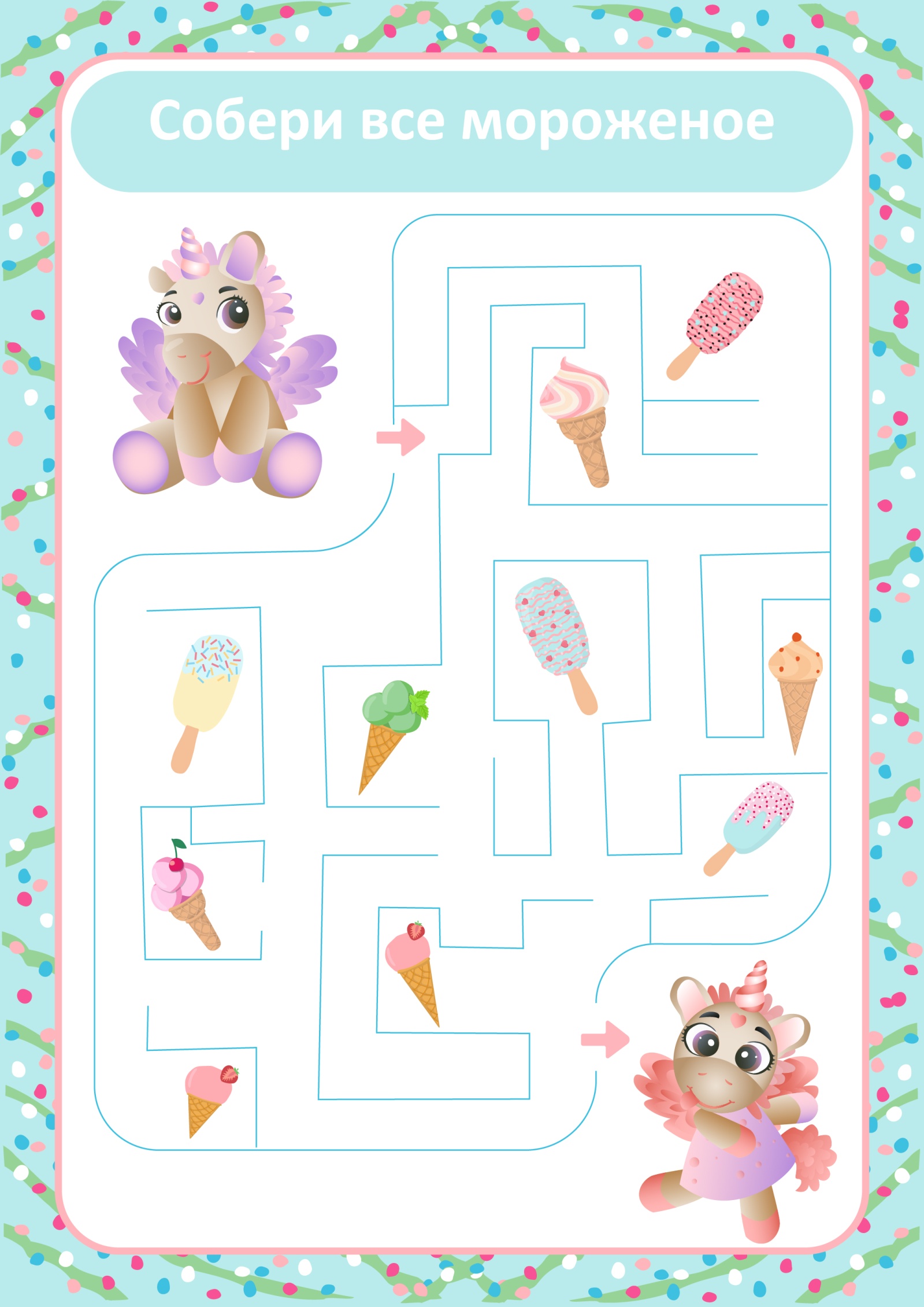 Проведи линию по лабиринту так, чтобы собрать всю коллекцию вкусного мороженого. Посчитай, сколько всего мороженого ты собрал?