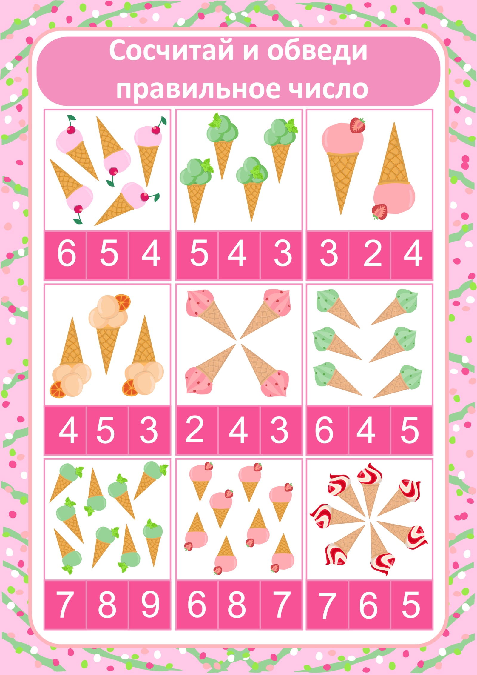 Посчитай количество шариков мороженного в рожке и проведите линию к нужному числу. Линия может быть разным цветом, прямой, волнистой, пунктирной…
