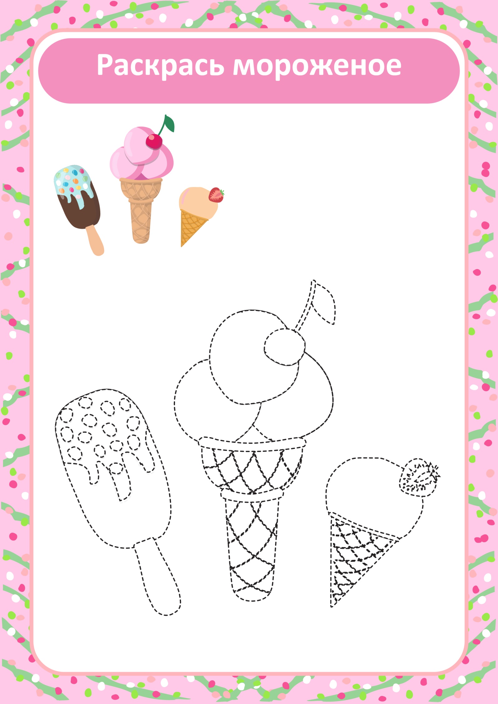 Проведи нужными цветными карандашами по линиям контура, а потом раскрась все мороженое.