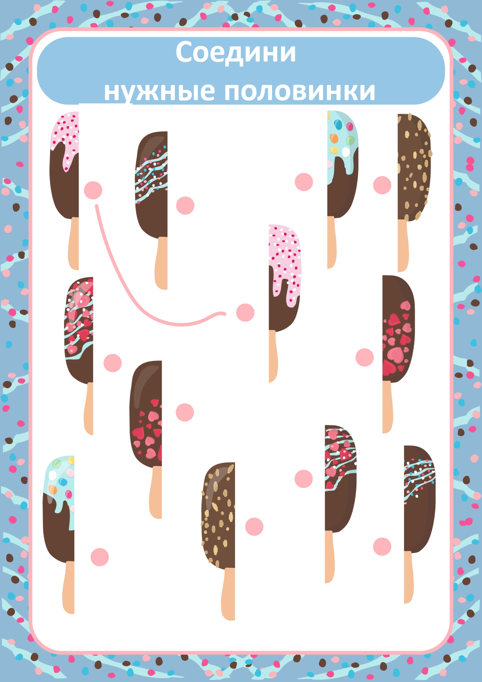 Соедини нужные половинки мороженого с помощью линий