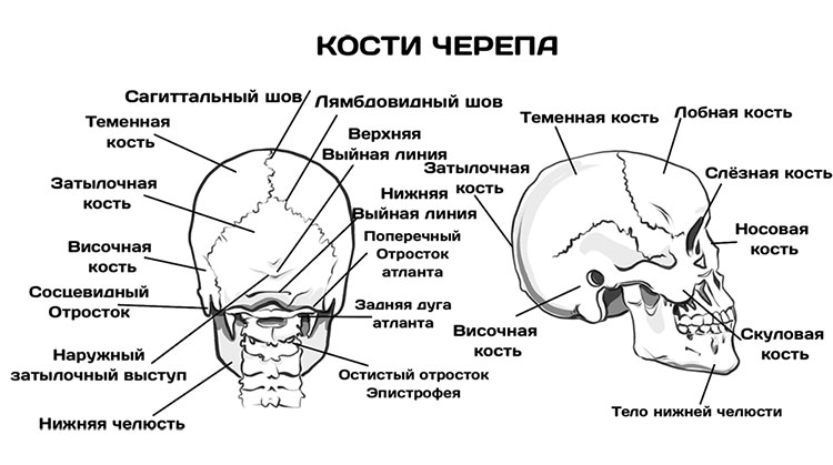 Кости черепаДля чего нам знать анатомию черепа? Дело в том, что кости черепа связаны между собой особым видом неровных швов. Их хорошо видно на рисунке 2. Такое соединение костей дает возможность совершать им микродвижения при дыхании. Одна из главных проблем возрастных изменений костей черепа состоит в том, что эти швы становятся жесткими, кости срастаются, и их микродвижение ухудшается. Это приводит к тому, что нарушается отток спинномозговой жидкости и формируется заместительная гидроцефалия. В этом случае жидкость не может выйти свободно из полости черепа, задерживается там и оказывает давление на полушария головного мозга, что в свою очередь приводит к нарушению работы мозга и появлению возрастных когнитивных нарушений. Поэтому знания о строении костей черепа помогут нам сохранить здоровье мозга.