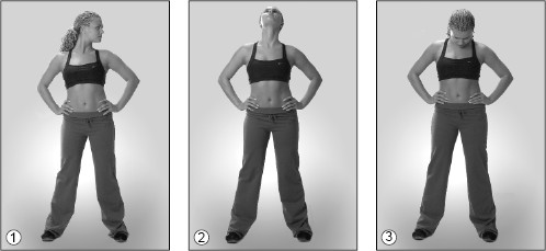 Станьте прямо, ноги на ширине бедер, руки расположены на бедрах. Выполните плавные, медленные движения головой влево, вправо, назад, вперед.