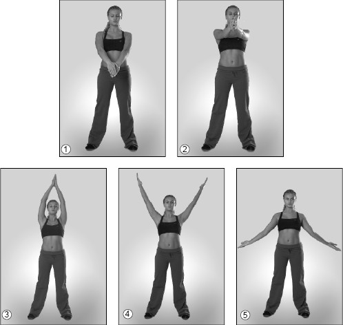 Станьте прямо, ноги на ширине бедер, руки расположены перед собой (как показано на фото), взгляд направлен на руки. Выполните в среднем темпе широкие круговые махи руками: перед собой вверх, через стороны вниз, в исходное положение.
