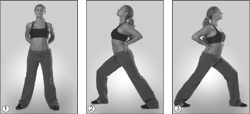Выполните выпад вправо, затем, надавливая ладонями на поясницу, подайте таз вперед. Вернитесь в исходное положение и повторите упражнение в другую сторону. Чередуйте выпады вправо и влево с обязательным возвратом в исходное положение. Темп выполнения – плавный.
