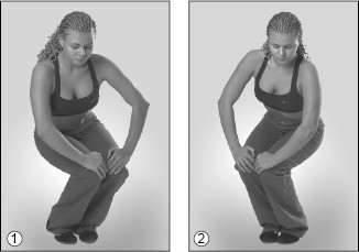 Сохраняя прямое положение спины, наклоните туловище вперед и расположите руки на коленях. Сгибая ноги в коленном суставе, выполните приседания (стопы должны быть все время плотно прижаты к полу), затем, выпрямляя ноги, сделайте надавливание руками на колени. Темп выполнения – энергичный.
