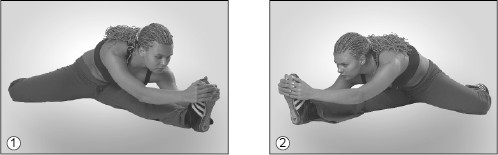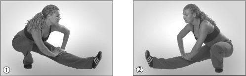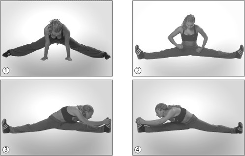 Обопритесь ладонями в пол и медленно опускайте таз вниз до положения «поперечный шпагат» (настолько широко, насколько сможете). В максимально низкой для вас точке выполните пружинящие покачивания таза вниз. Затем опустите на пол ягодицы и широко разведите ноги в стороны. Расслабьте паховые мышцы и мышцы задней, передней и внутренней поверхности бедер энергичными похлопываниями кулаками по мышцам. Оставаясь в этом положении, выполните пружинящие наклоны туловища сначала к правой и левой ноге, затем, слегка разворачивая корпус, наклоны за правой и левой ногой. В конце упражнения, после выполнения всех заданных повторов, сделайте глубокий наклон туловища вперед, стараясь грудью коснуться пола, и задержитесь в этом положении на 10–20 секунд.