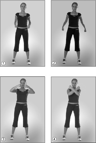 Станьте прямо, ноги на ширине бедер, руки согнуты в локтях и расположены на уровне груди, пальцы сжаты в кулак. Выполните на два счета небольшое отведение локтей назад (соединяя лопатки), выпрямив руки в стороны, выполните на два счета отведение прямых рук назад (соединяя лопатки). Темп выполнения быстрый, на 4 счета.