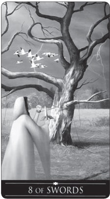 8-ка Мечей. Восьмёрка Мечей среди картомантов традиционно считается «пугающей» картой с негативной энергией. Примечательно, что все последующие номерные карты Мечей также относят к группе «пугающих». Но в контексте магии Таро нет плохих или хороших карт – все карты, включая и «пугающие», используются только как инструмент в операции. В то же время характер карты позволяет придать ей негативное содержание и соотнести с «нападением», агрессией, астральным ударом.