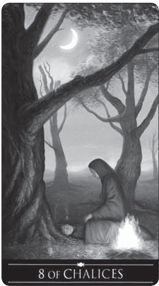 8-ка Чаш. 8-ка Чаш в данной колоде указывает на защитную функцию и магию: «Женщина в ритуальной одежде, сидя у костра под Луной, поправляет постель своего ребёнка». Женщина, изображённая на этой карте, нашла защиту от ночных опасностей под раскидистой кроной старого дуба.
