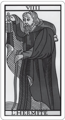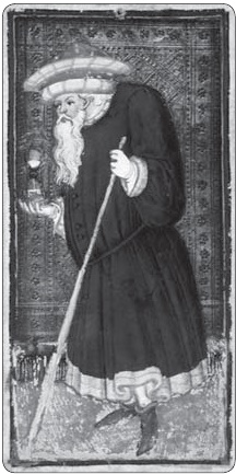 Привычный нам монах с фонарём и посохом появляется на картах Марсельской серии, сменив персонажа с песочными часами, изображённого на картах серии Висконти, которые, как более ранние, должны были быть ближе к прото-таро, и именно в них следует искать первоначальную идею Аркана.