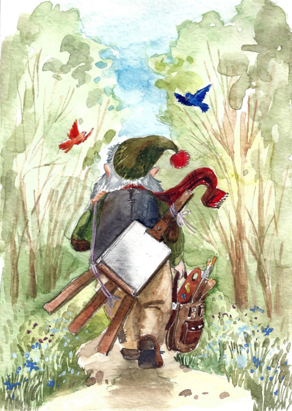 Постепенно пелена тумана освобождала лес из своих оков. И как только лесные птицы начинали выводить свои веселые трели, гном брал мольберт, палитру, кисти и краски и отправлялся на прогулку.
