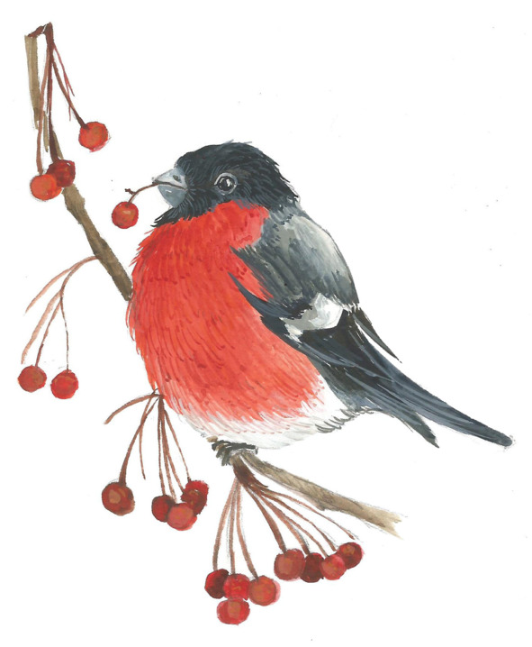 А еще холст с забавным снегирем с ярко красной грудкой, который сидел на ветке рябины и лакомился сладкими замерзшими ягодами.