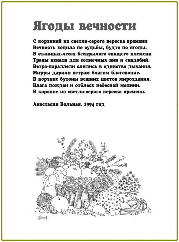 С корзиной из светло-серого вереска времениВечность ходила по судьбы, будто по ягоды.В станицах-лесах бескрылого спящего племениТрАвы искала для солнечных вин и снадобий.ВетрА-параллели слились в единстве дыхания.МИрры дарили ветрам благим благовоние.В корзине бутоны вешних цветов мироздания,Влага дождей и отблеск небесной молнии.В корзине из светло-серого вереска времени.1994 год