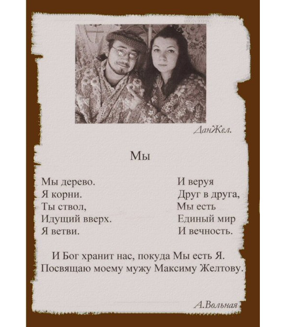 Мы дерево.Я корни.Ты ствол,Идущий вверх.Я ветви.И веруяДруг в друга,Мы естьЕдиный мирИ вечность.И Бог хранит нас, покуда Мы есть Я.