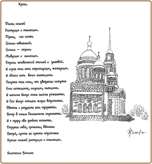 Танец камнейРастущих и слышащих.Трель, как капельДолины невидимой.Долины-страныЖивущих и дышащих.Страны человеческой птичьей и змеевой.И город там есть страждущих, жаждущих.И облако есть вечно смеющихся.Пасутся там кони, что звёздами кажутсяКони молящихся, ищущих, льющихся.И мальчик Иисус алым маком рождается.И Бог Иисус солнцем жизни возносится.Светом и разумом день озаряется.Вечер в камин башмачком опускается.Ива-печальница к озеру клонится.Струями неба, громами, вёснамиВетрА, купола да кресты позолоченыХрама камней растущих и слышащих.1994 год