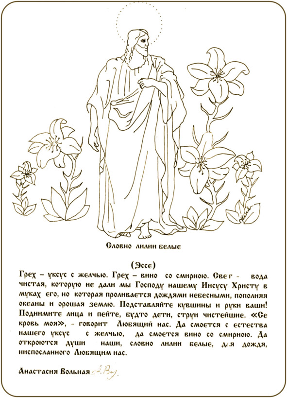 Грех – уксус с желчью. Грех – вино со смирною. Свет – вода чистая, которую не дали мы Господу нашему Иисусу Христу в муках его, но которая проливается дождями небесными, пополняя океаны и орошая землю. Подставляйте кувшины и руки ваши! Поднимите лица и пейте, будто дети, струи чистейшие. «Се кровь моя» – говорит Любящий нас. Да смоется с естества нашего уксус с желчью, да смоется вино со смирною. Да откроются души наши, словно белые лилии, для дождя, ниспосланного Любящим нас.