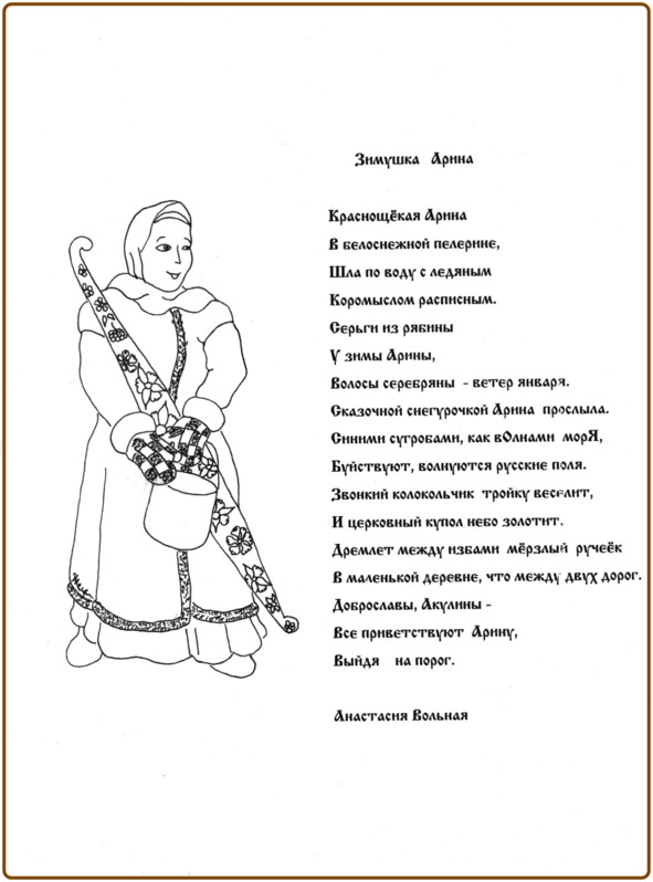 Краснощёкая АринаВ белоснежной пелерине,Шла по воду с ледянымКоромыслом расписным.Серьги из рябиныУ зимы Арины,Волосы серебряны – ветер января.Сказочной снегурочкой Арина прослыла.Синими сугробами, как вОлнами морЯ,Буйствуют, волнуются русские поля.Звонкий колокольчик тройку веселит,И церковный купол небо золотит.Дремлет между избами мёрзлый ручеёкВ маленькой деревне, что между двух дорог.Доброславы, Акулины —Все приветствуют Арину,Выйдя на порог.1995 год