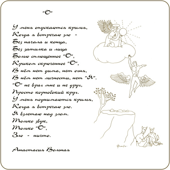 У меня опускаются крылья,Когда я встречаю зло —Без начала и концаБез затылка и лицаБолью сплющенное «О»,Криком скрюченное «О»,В нём нет дыма, нет огня,В нём нет личности, нет «Я».«О» не враг мне и не друг,Просто корнобокий круг.У меня поднимаются крылья,Когда я встречаю зло.Я взлетаю над злом.Только звук,Только «О»,Зло – ничто.2009 год